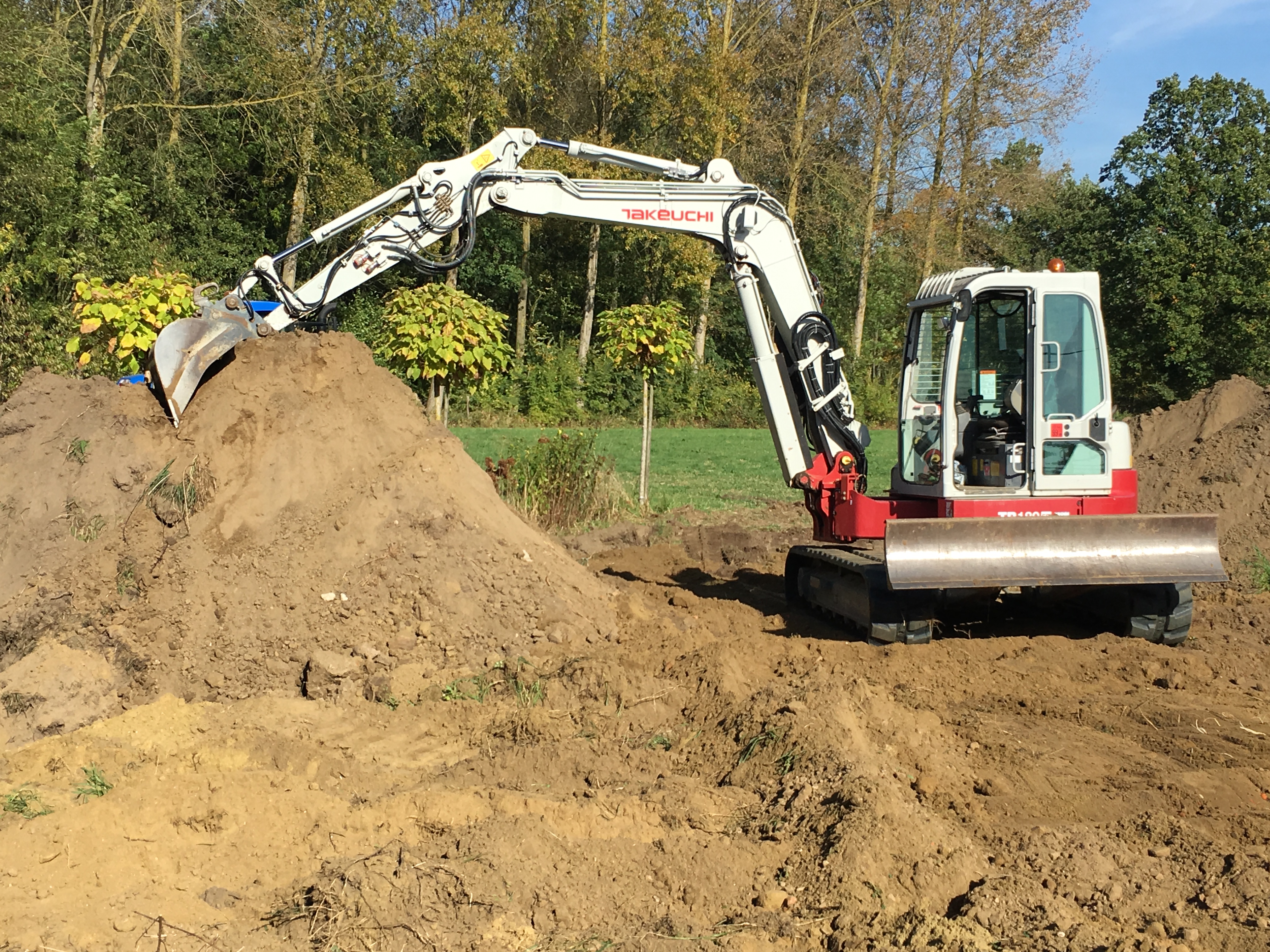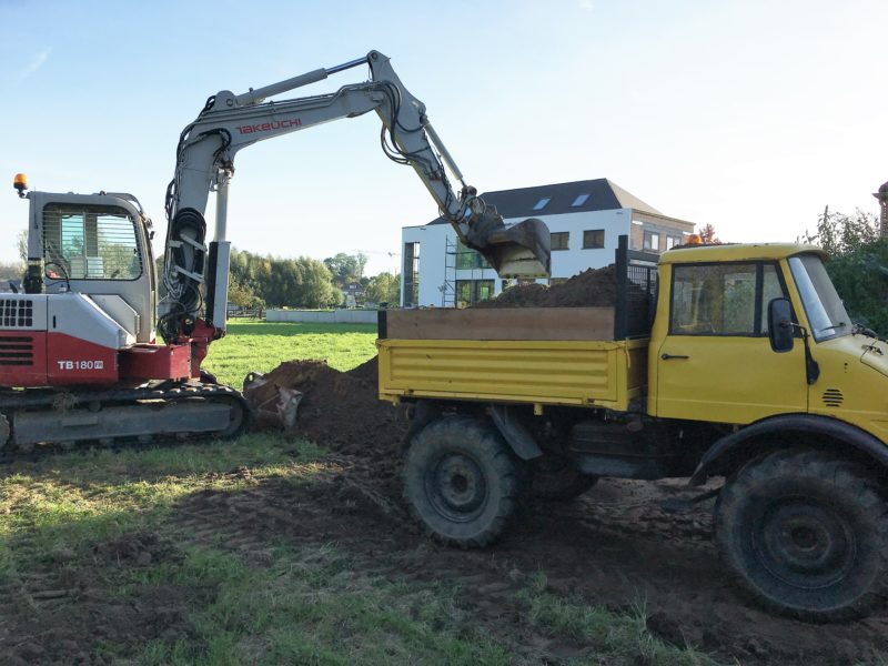 Niveleren tuin Vlierzele Niveleren voor- en achtertuin bij nieuwbouwwoning. Aanvoeren van de bovenaarde rond de woning met Unimog