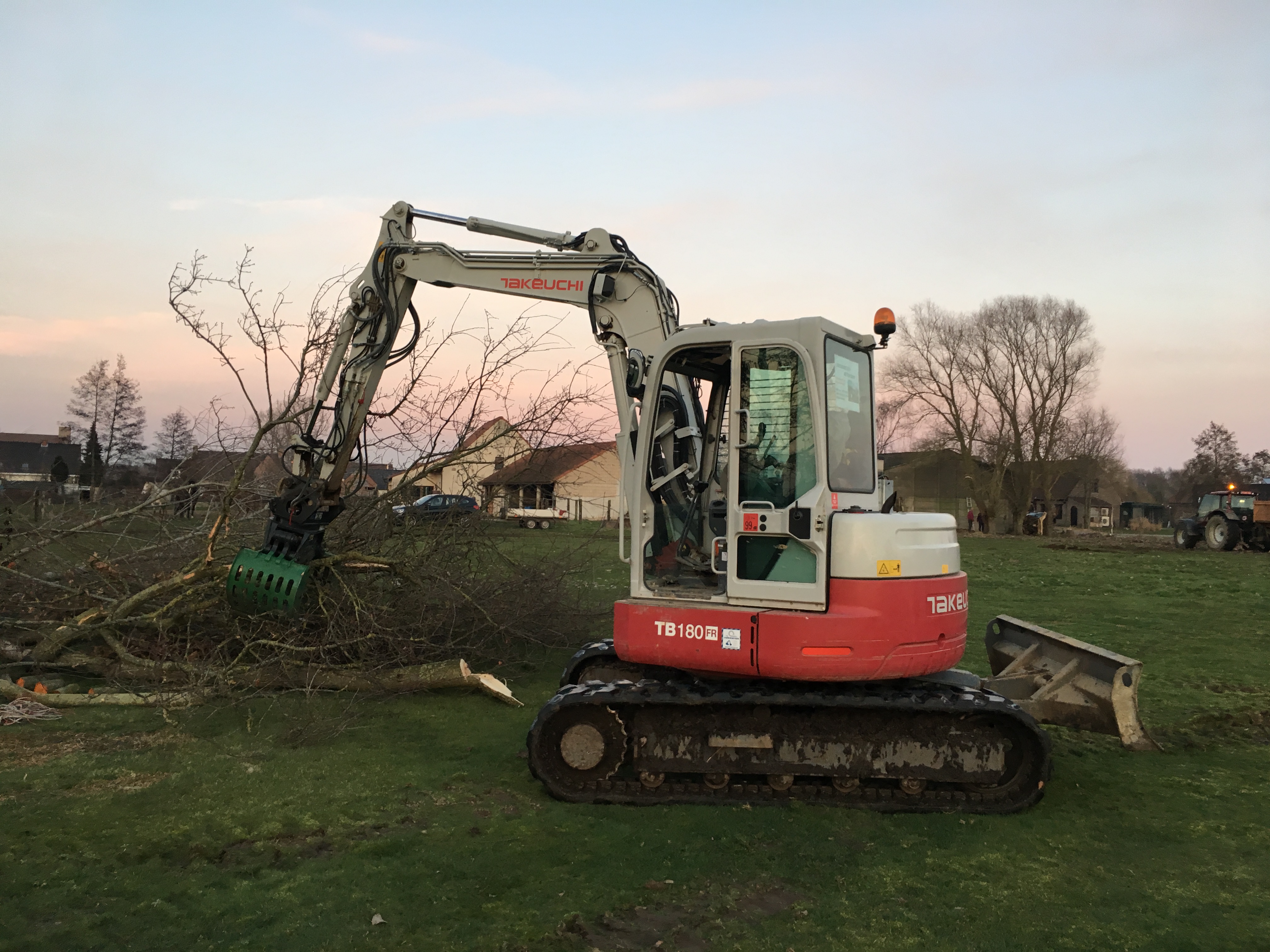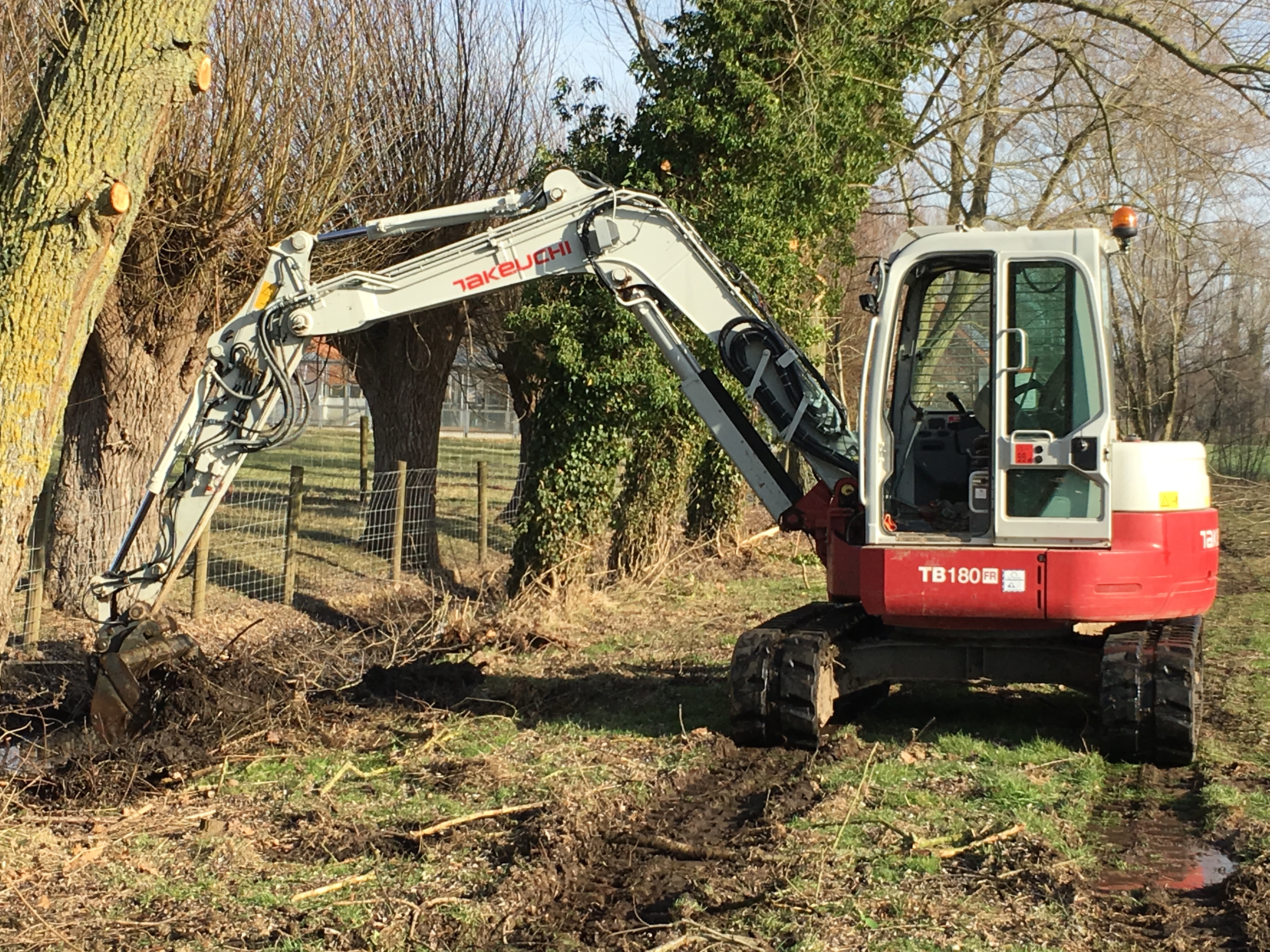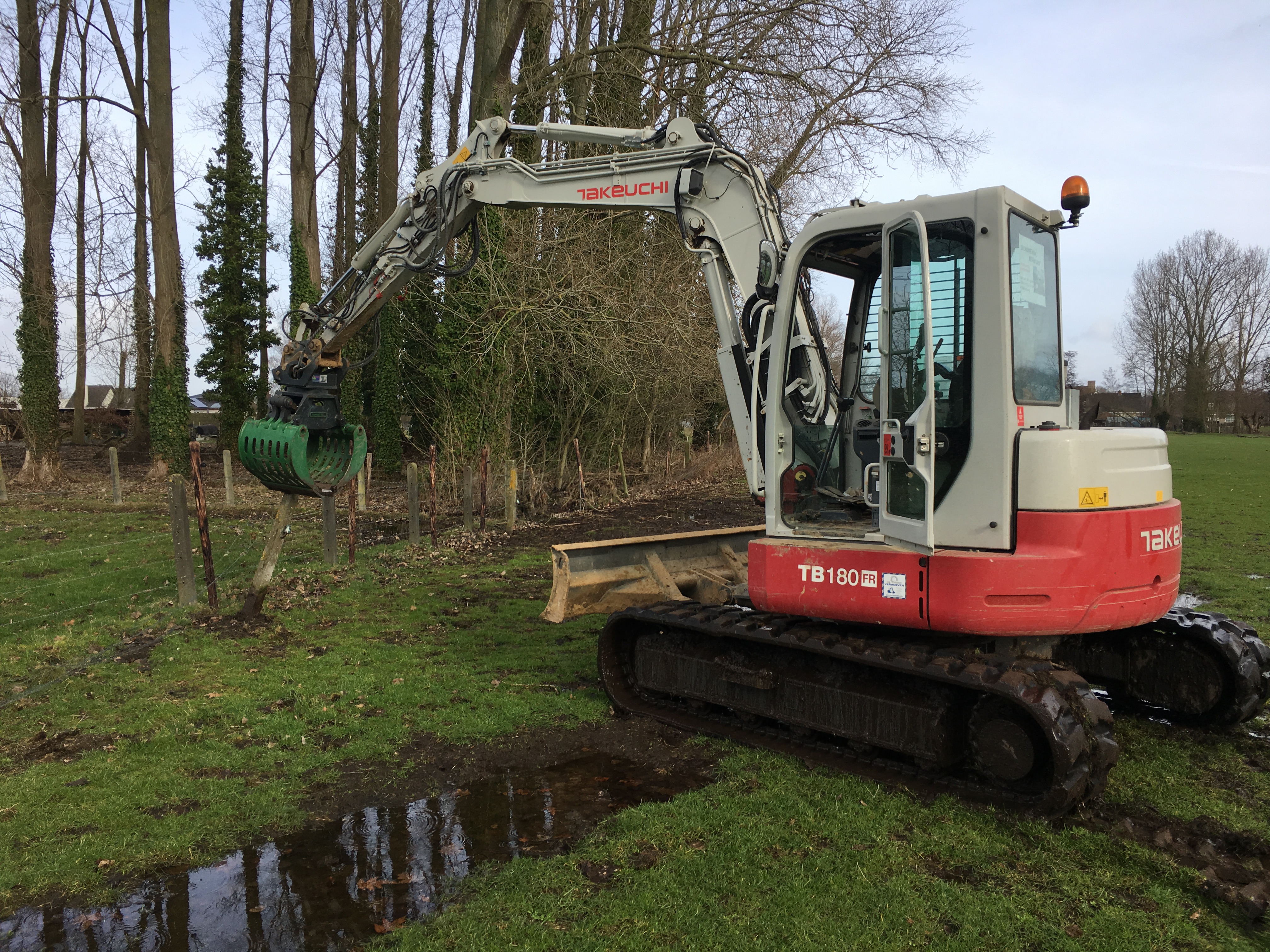 Opruimen omheining weide Zulte Verwijderen weidepalen met sorteergrijper. Verplaatsen en sorteren kaphout met sorteergrijper. Ruimen van grachten